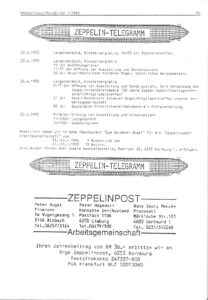 1973 bis 1993 – Es ist das Jahr des 20-jährigen Bestehens der ARGE Zeppelinpost. In dem Jahr des Jubiläums gibt es mehrere Treffen und Veranstaltungen und die Teilnahme von Mitgliedern an Ausstellungen. Im Rundbrief 1/1993 erscheinen dazu folgende Informationen: