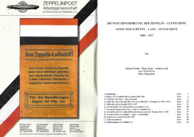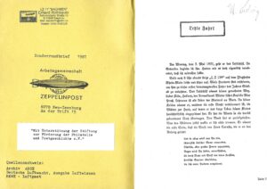 Das Heft habe ich von einem langjährigen Zeppelin-Sammler übernommen. Als Quellen nennt die ARGE dabei das eigene Archiv, die Ausgabe der Deutschen Luftwacht „Luftwissen“ und REWE Luftpost. Hinzu kommt ein Aufkleber, dass das Heft offenbar mit Unterstützung der Stiftung zur Förderung der Philatelie und Postgeschichte entstanden ist.