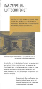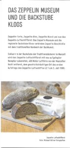 Als die großen Zeppelin-Luftschiffe zum Alltag am Himmel gehörten gab es bereits ein Luftschiffbrot. Damals wurde es von der Bäckerei der Zeppelin Wohlfahrt GmbH a.B. als Spezialität gebacken. Ursprünglich sollte es nur für die Luftschiffe selbst sein. Doch dann wurde es fest in das Sortiment aufgenommen. Nun ist diese Tradition in der Zusammenarbeit von Zeppelin-Museum und Backstube Kloos neu belebt worde.