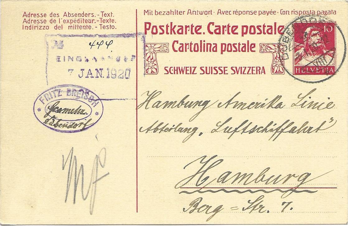 Bei der Hamburg Amerika Linie wurde in der Abteilung Luftschifffahrt in Hamburg am 7.1.1920 der Eingang der folgenden Karte dokumentiert: