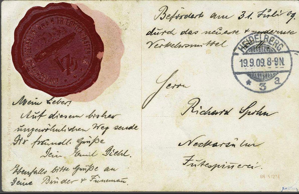 Willkommen › Foren › Zeppelinpost der Pionierzeit › LZ 5 (Z II – Ersatz) › Abwurfkarte mit Siegelmarke Heidelberg 19.09.1909