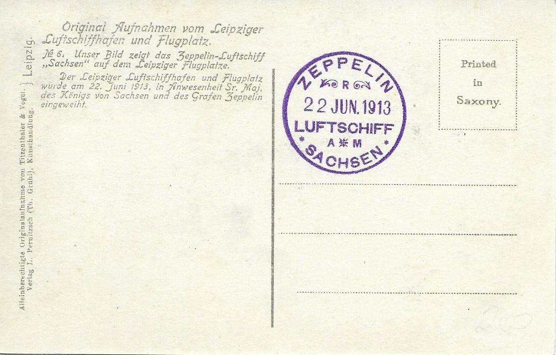 Auf Belegen des Jahres 1913 taucht ein Restaurant-Stempel aus Leipzig auf, der dem Bordstempel des Luftschiffs „Sachsen“ ähnelt und auf diesen Bezug nimmt. Die folgende Blanko-Karte aus der offiziellen Serie der Luftschiffhafen-Aktiengesellschaft Leipzig zeigt diesen Stempel.