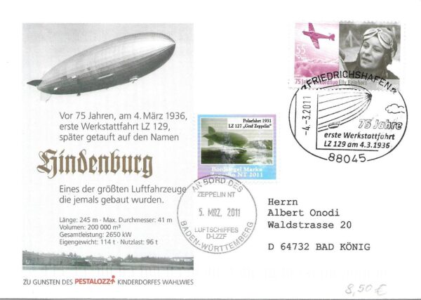 Vor 10 Jahren zum 75. Jahrestag der Fahrt gab es zur Erinnerung an das Ereignis einen Aufstieg des Zeppelin NT und den abgebildeten Beleg der Kinderdorf Luftpost.