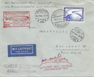 Mit der Landungsfahrt in die Hauptstadt Ungarns, nach Budapest, begann die Fahrt-Saison des Jahres 1931 für das Luftschiff LZ 127 „Graf Zeppelin“. Am 28.03.31 fuhr es von Friedrichshafen nach Budapest. Der folgende Brief wurde in Friedrichshafen aufgeliefert und war für diese Etappe bestimmt. Er trägt den roten Sonderbestätigungsstempel und in gleicher Farbe den ungarischen Sonderankunftsstempel. Abgestempelt am Abfahrtsort am 28.3.31 wurde er mit dem Poststempel von Budapest am 29.03.31 versehen. Gekennzeichnet ist er unten links als Brief vom Briefmarkenhaus Wilhelm Sellschopp aus Hamburg, das bereits 1891 gegründet worden ist.