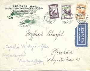 Auf die Rückfahrt ging der nächste Brief der ungarischen Post aus Budapest nach Pforzheim. Er trägt als Frankatur die zwei zu diesem Ereignis erschienenen Sonderbriefmarken Ungarns und eine weitere Briefmarke zur Ergänzung. Oben links wurde der ungarische Sonderbestätigungsstempel Type I aufgebracht.